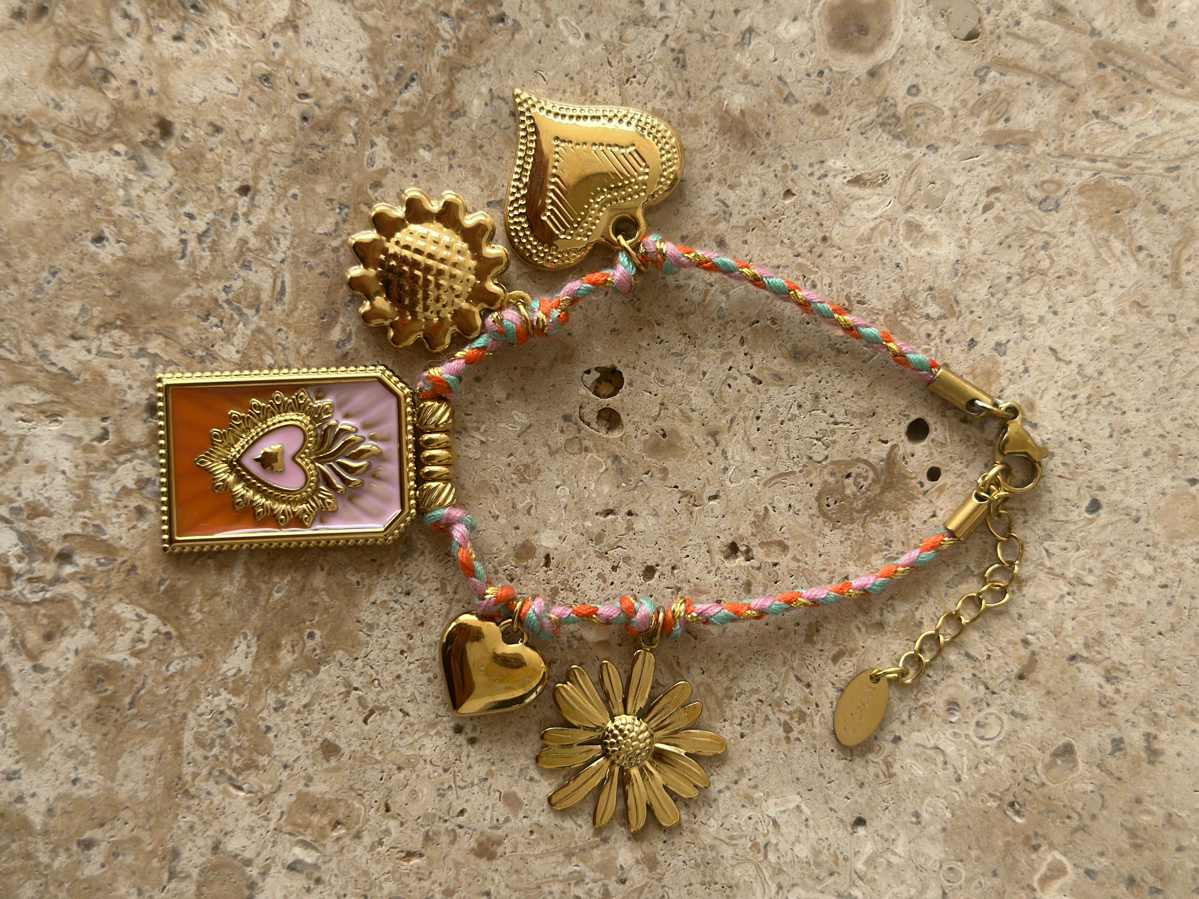 Le bracelet AZTEA rose incarne l’équilibre parfait entre féminité et énergie solaire. Tissé à la main dans des tons rose poudré et doré, il s’orne d’un médaillon talisman doré symbolisant la protection, l’amour et la lumière intérieure.