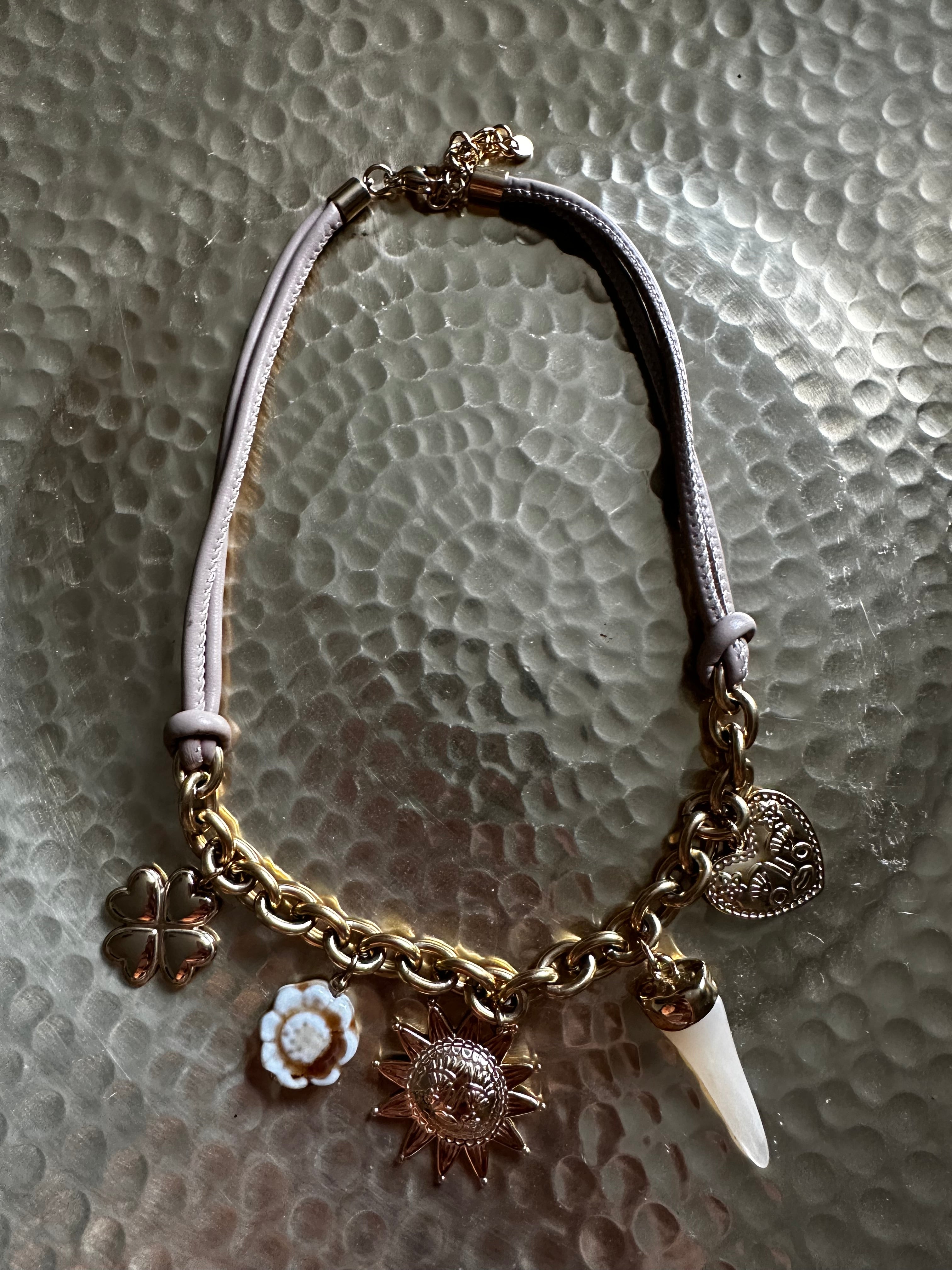 Ses charms symboliques — trèfle porte-bonheur, fleur nacrée, soleil doré et corne blanche protectrice — se mêlent à une chaîne dorée et un cordon poudré pour un équilibre parfait entre élégance et esprit bohème.