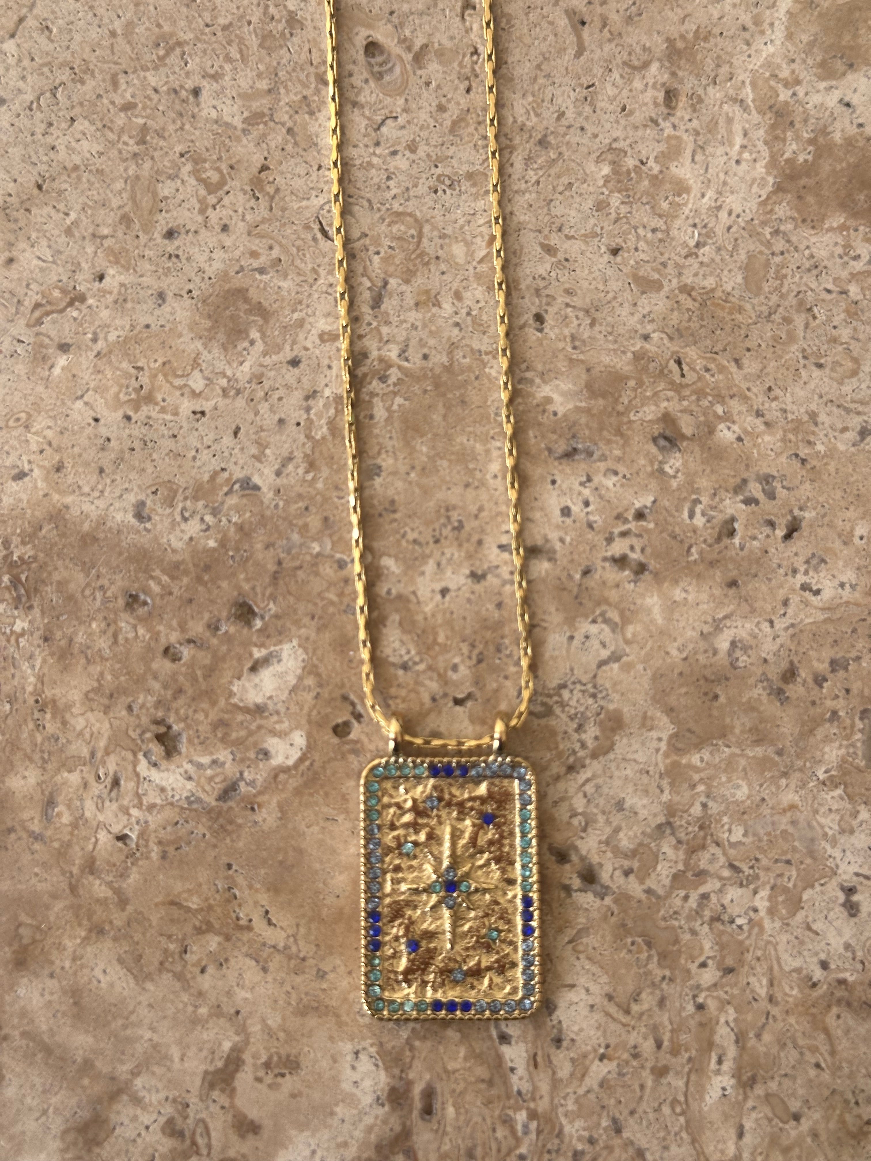 Laissez-vous envoûter par la beauté céleste du Collier ÉCLIPSE, une création bohème chic au charme magnétique. Son pendentif rectangulaire doré aux reflets mystiques capture l’essence des astres et sublime votre aura avec subtilité. Comme une éclipse rare dans le ciel, ce bijou illumine votre style d’une lumière singulière et précieuse.