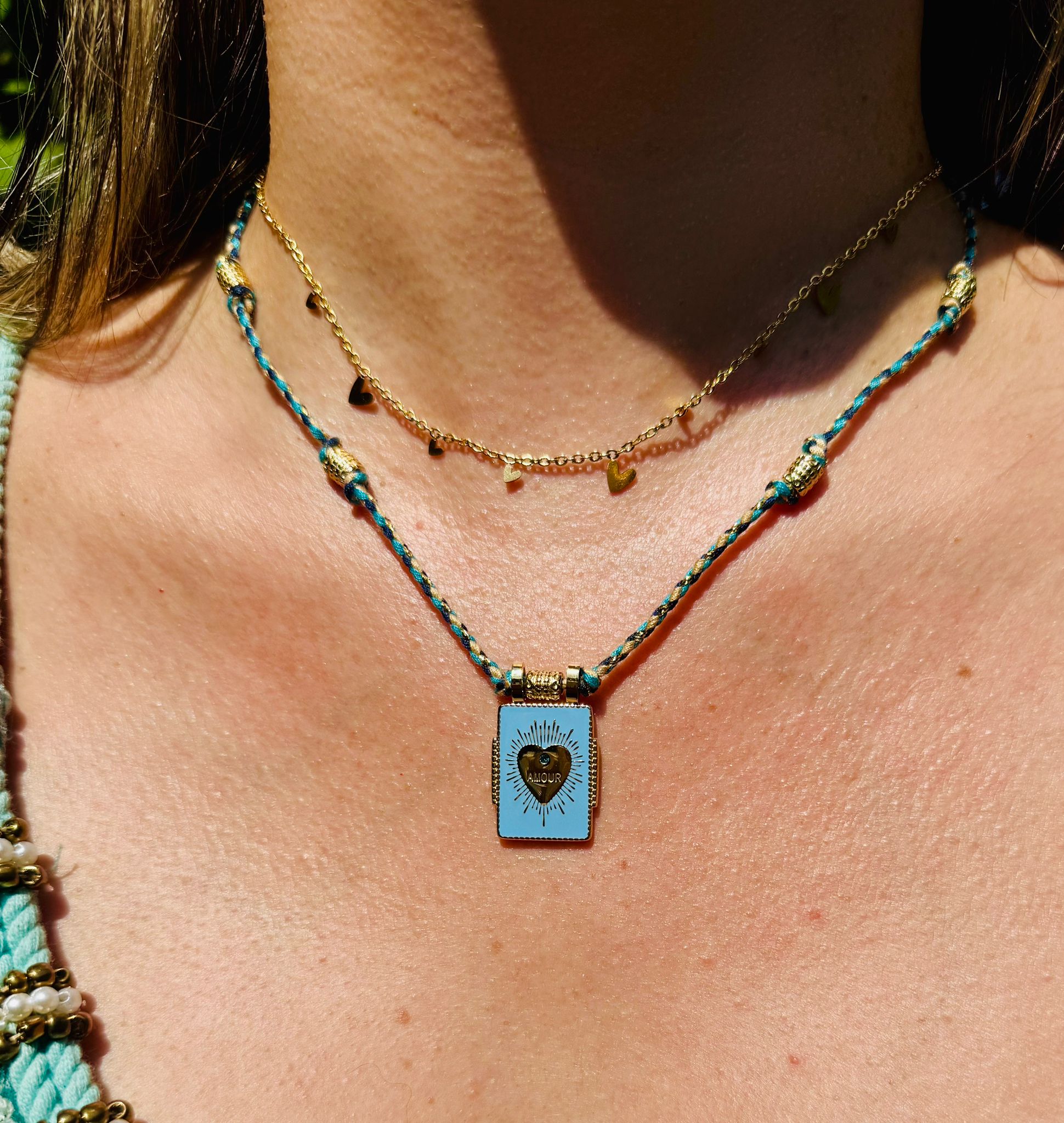 Parce qu’il illumine le décolleté d’un éclat doré-bleuté et se porte comme une invitation au voyage.