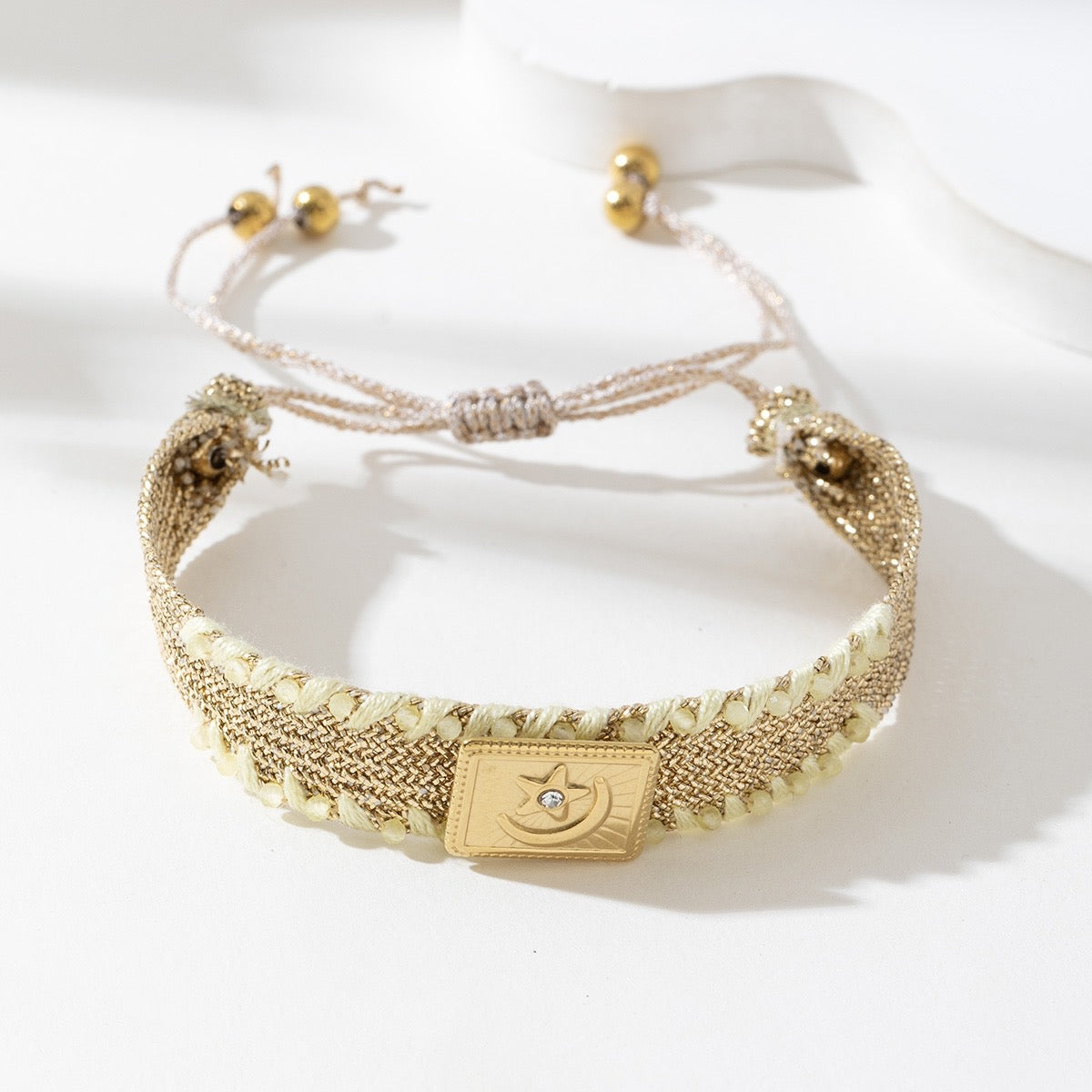 Laissez-vous séduire par l’élégance solaire de ce bracelet talisman doré, symbole de lumière et d’énergie positive. Finement tressé à la main, il allie raffinement et spiritualité, grâce à sa plaque dorée gravée d’une lune et d’une étoile délicatement ornées d’un cristal étincelant.