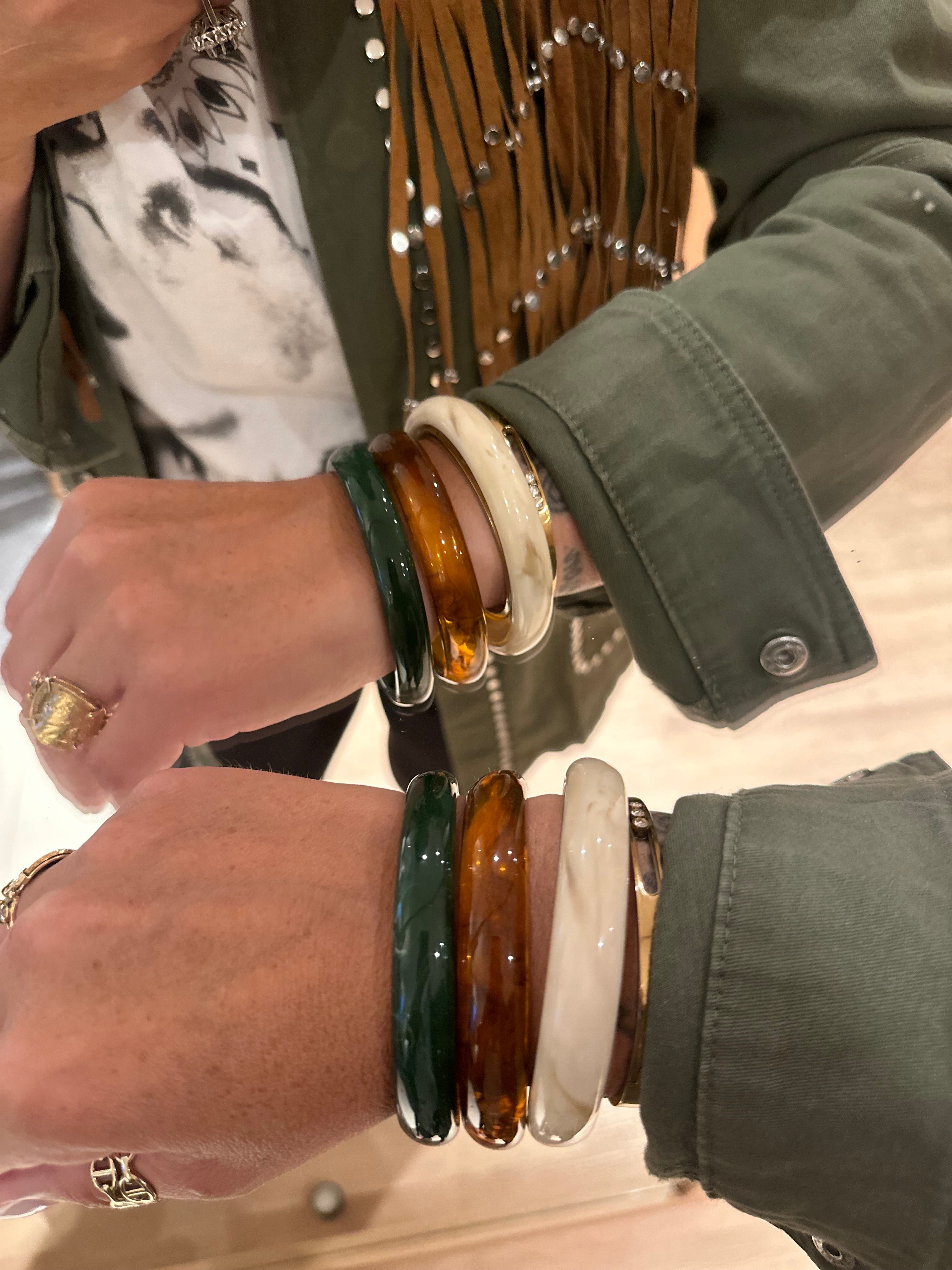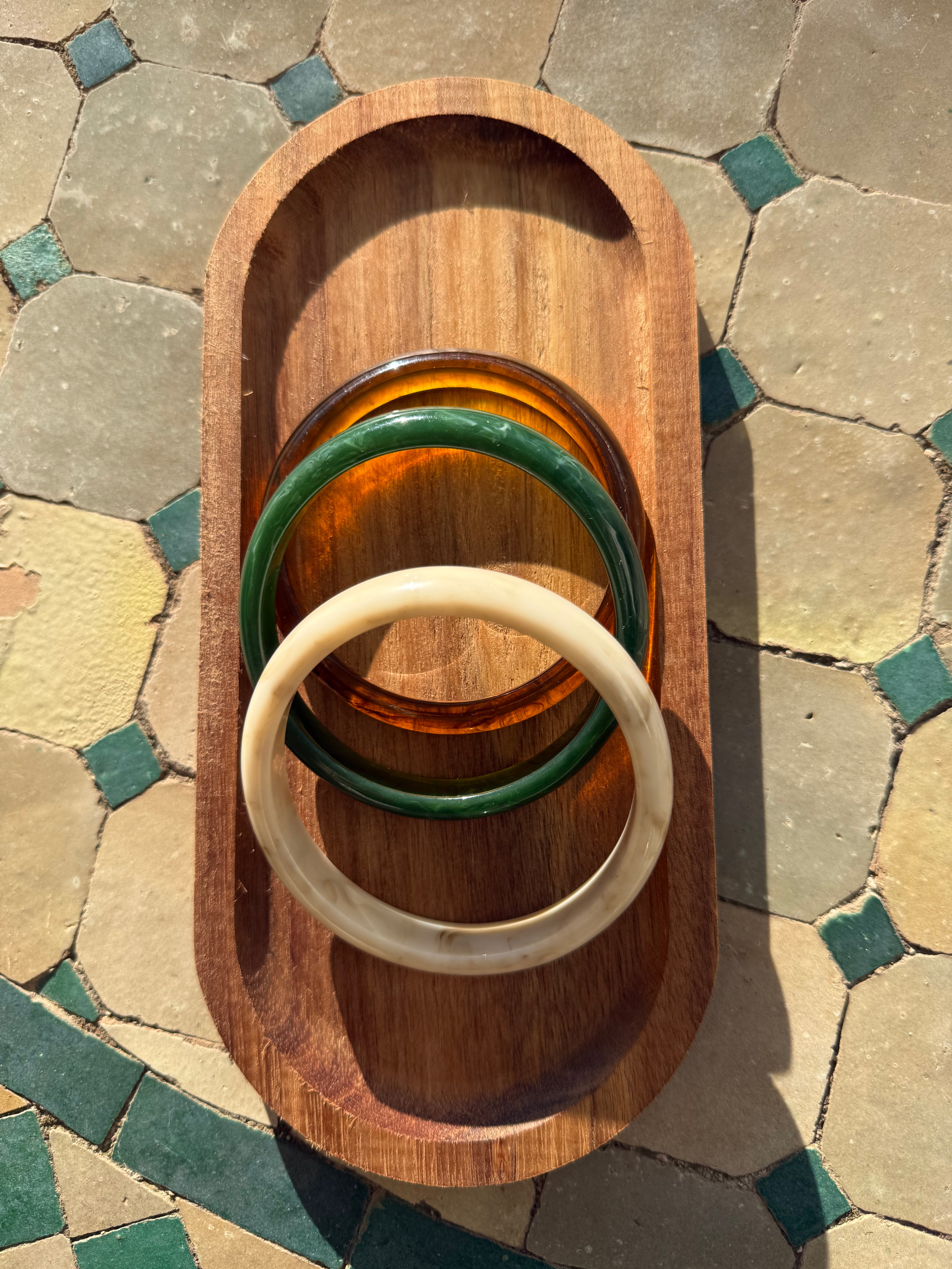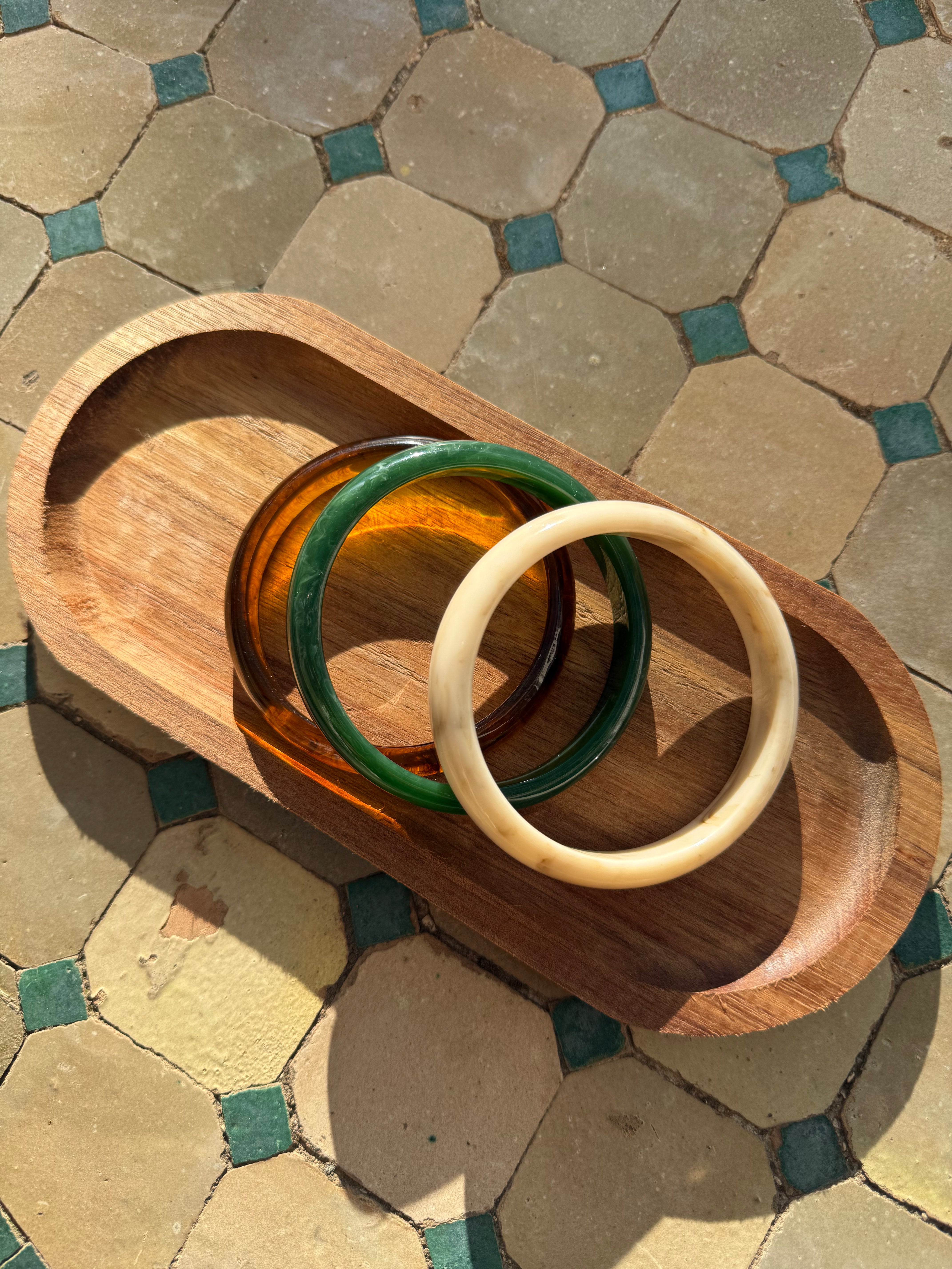 Inspiré par les teintes de la nature ambre, vert profond et ivoire, ce trio de bracelets est une ode à la lumière, à la terre et à l’harmonie bohème chère à Maison K.