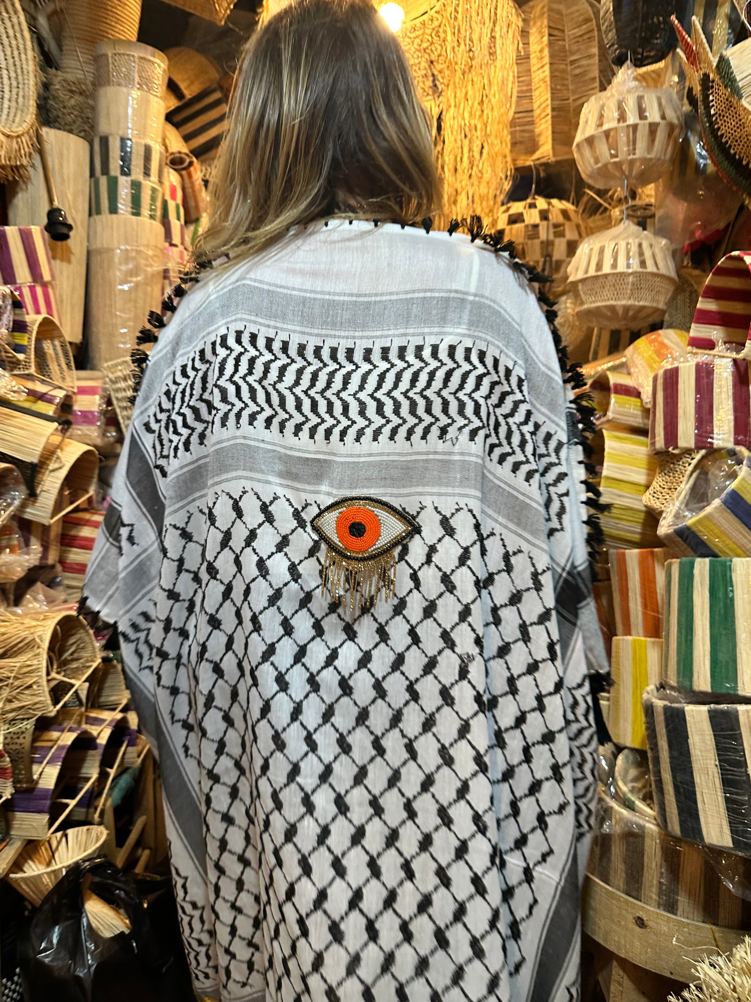 Son œil protecteur, dessiné à la main par Maison K et réalisé par un artisan couturier, fait de cette pièce un véritable talisman textile.