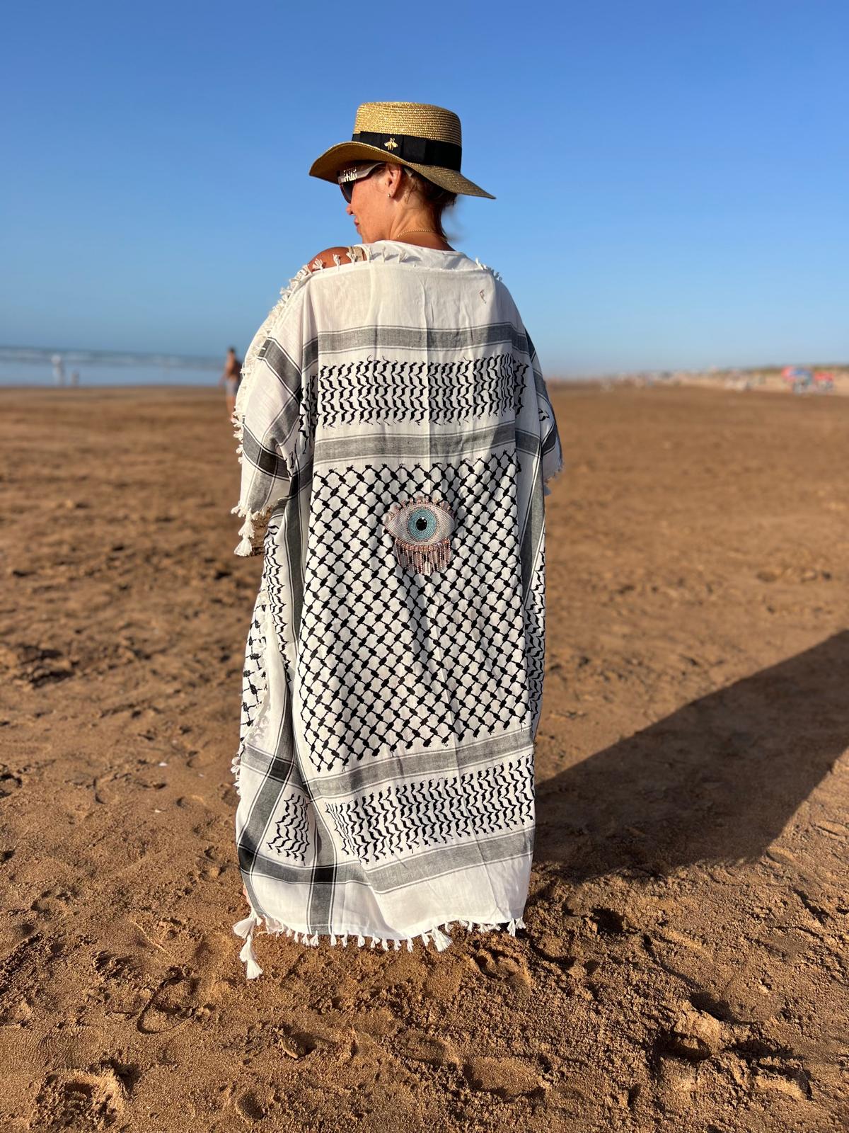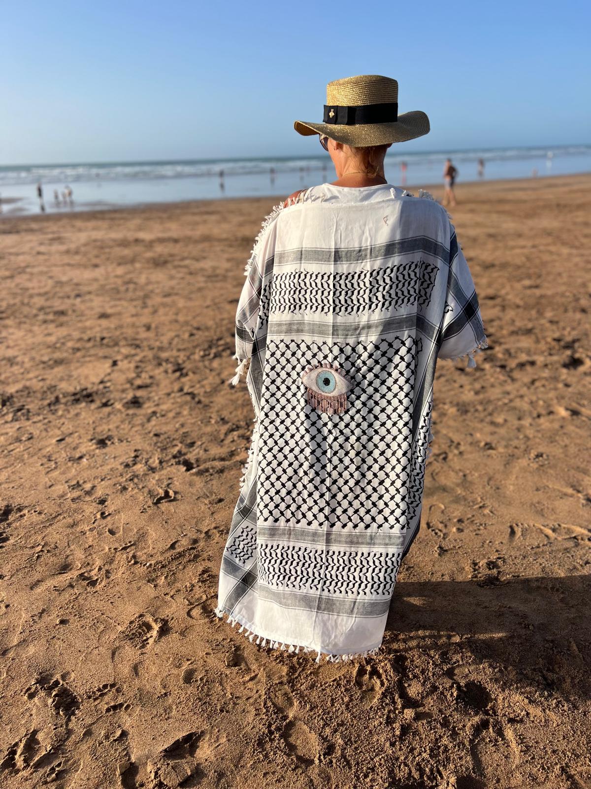 Tissé artisanalement dans un coton doux, il se distingue par son motif graphique et son œil protecteur brodé à la main, symbole de lumière et d’énergie positive.