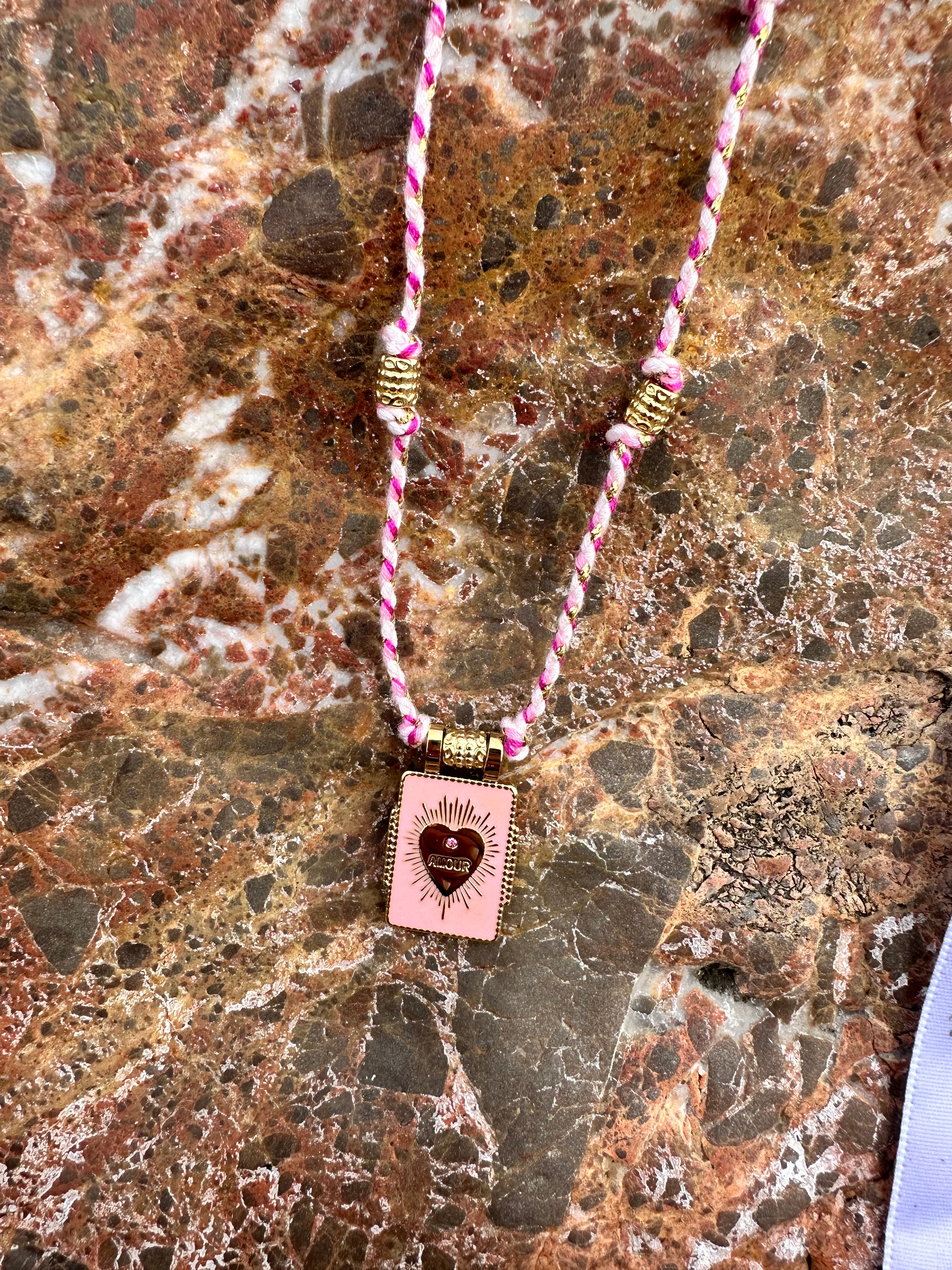 Le mélange subtil de la corde tressée rose et blanche, des détails dorés et du pendentif lumineux en fait une pièce unique, à la fois tendre et puissante. À porter seul pour une touche romantique ou associé à d’autres bracelets pour un look bohème moderne.