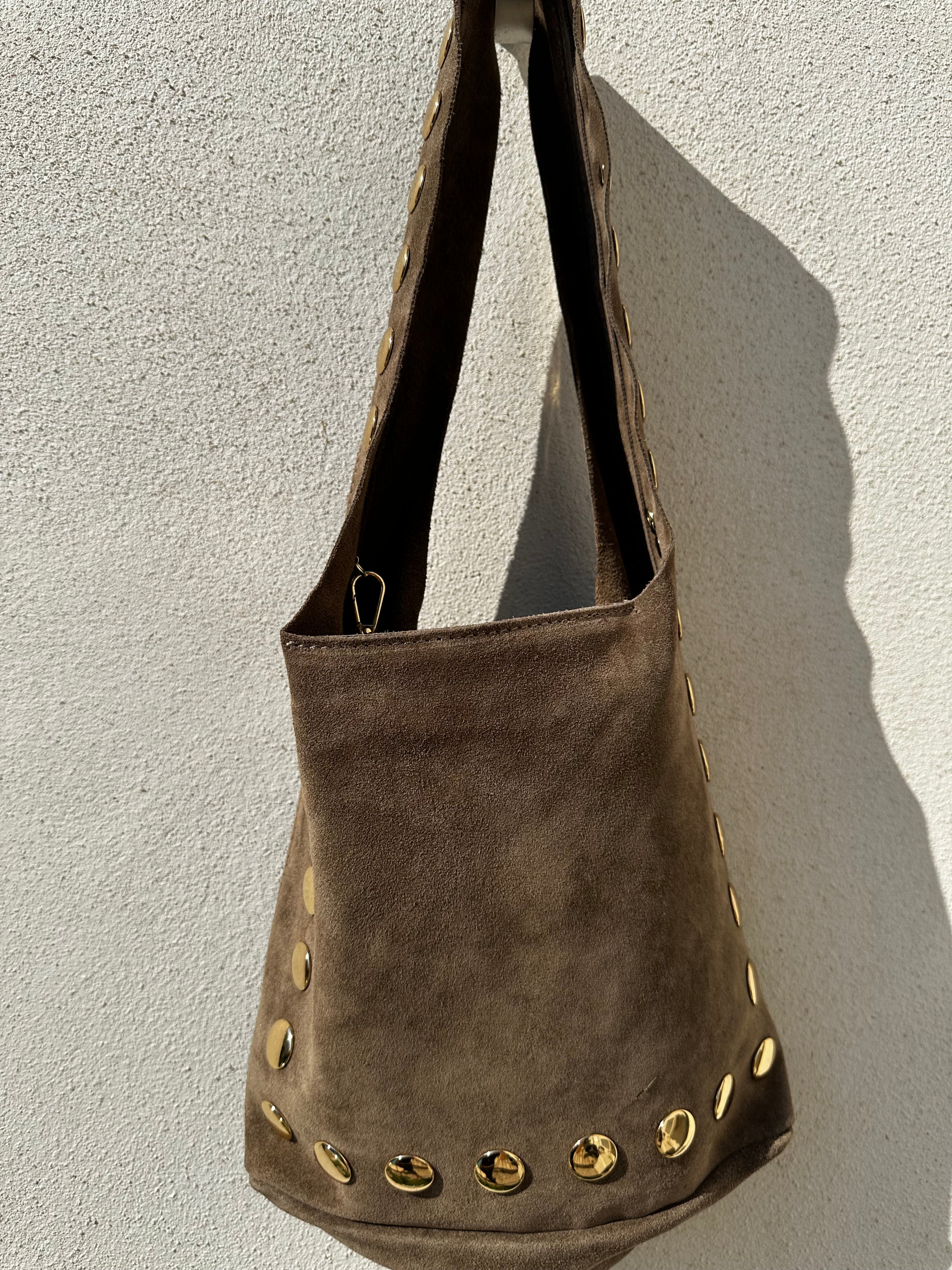 ✨Ce sac bohème en daim taupe incarne l’élégance naturelle et le charme solaire des créations Maison K. Confectionné dans un cuir daim douce et souple, il se distingue par ses grands œillets dorés qui lui confèrent un esprit à la fois vintage et contemporain.