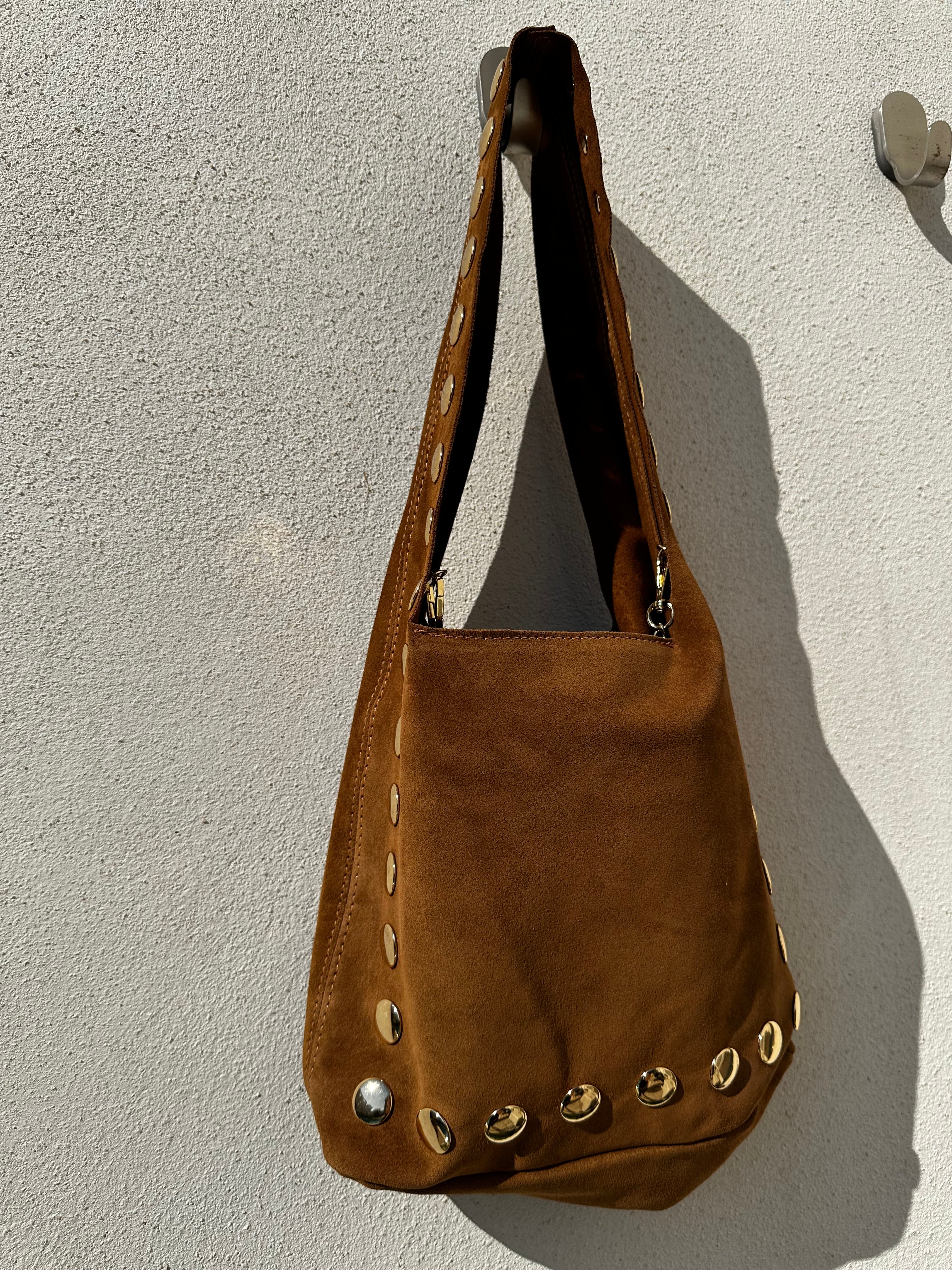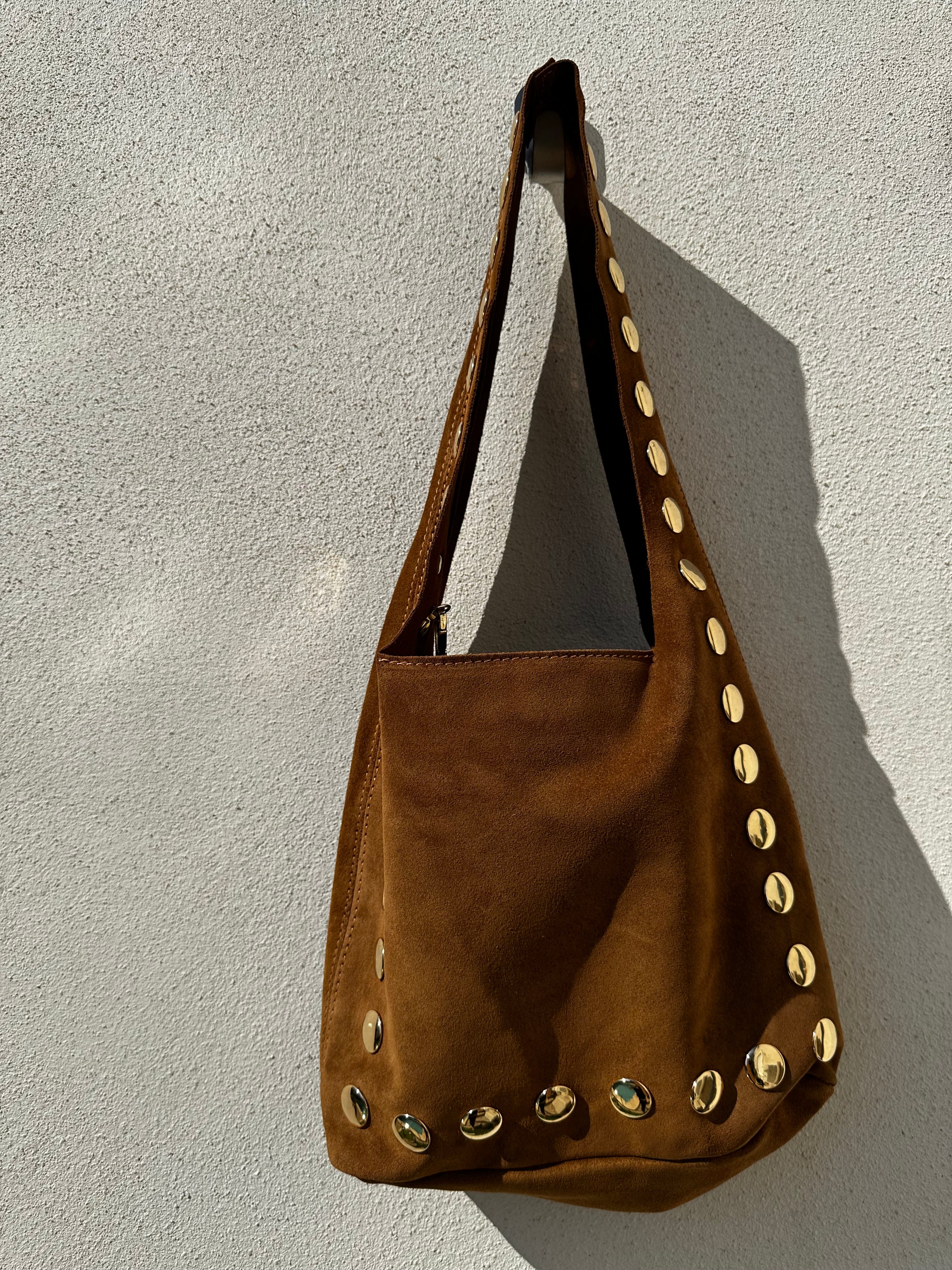 Son cuir camel, doux et veloutée, contraste avec les clous dorés martelés à la main, pour un effet à la fois brut et raffiné.