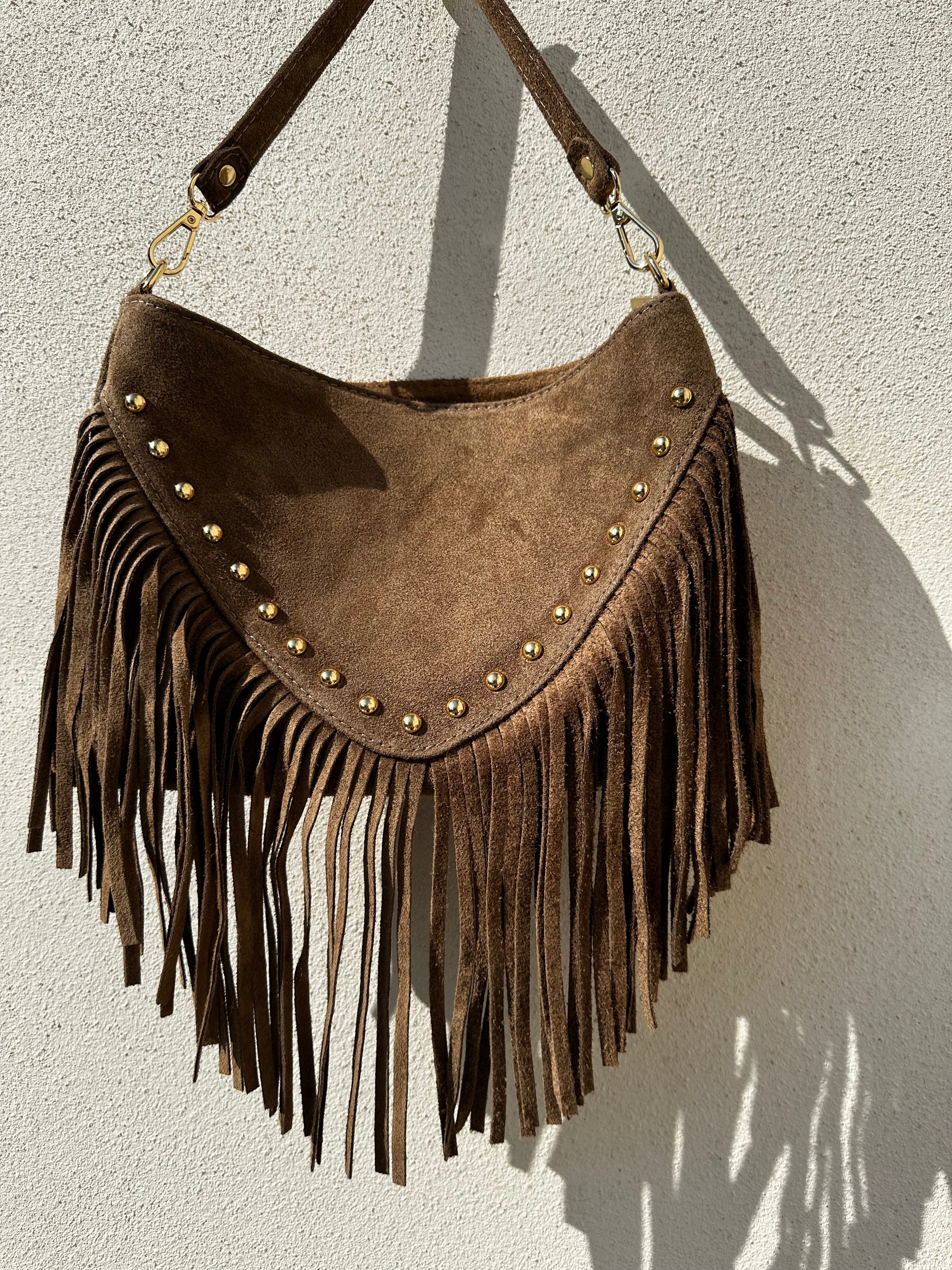 Le Sac SIENNA incarne l’esprit bohème chic par excellence. Confectionné en cuir daim souple et sublimé par ses longues franges fluides, il apporte ce mouvement élégant et solaire qui fait toute la différence.