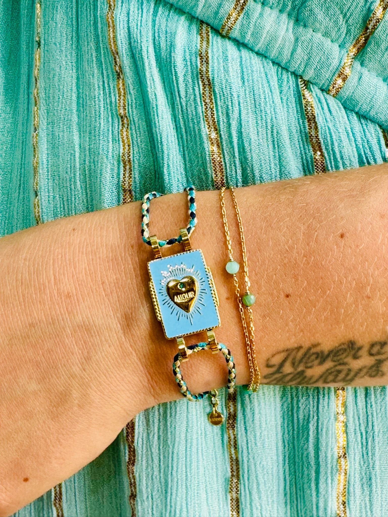 Le mĂ©lange subtil de la corde tressĂ©e bleu, des dĂ©tails dorĂ©s et du pendentif lumineux en fait une piĂšce unique, Ă la fois tendre et puissante. Ă porter seul pour une touche romantique ou associĂ© Ă dâautres bracelets pour un look bohĂšme moderne.