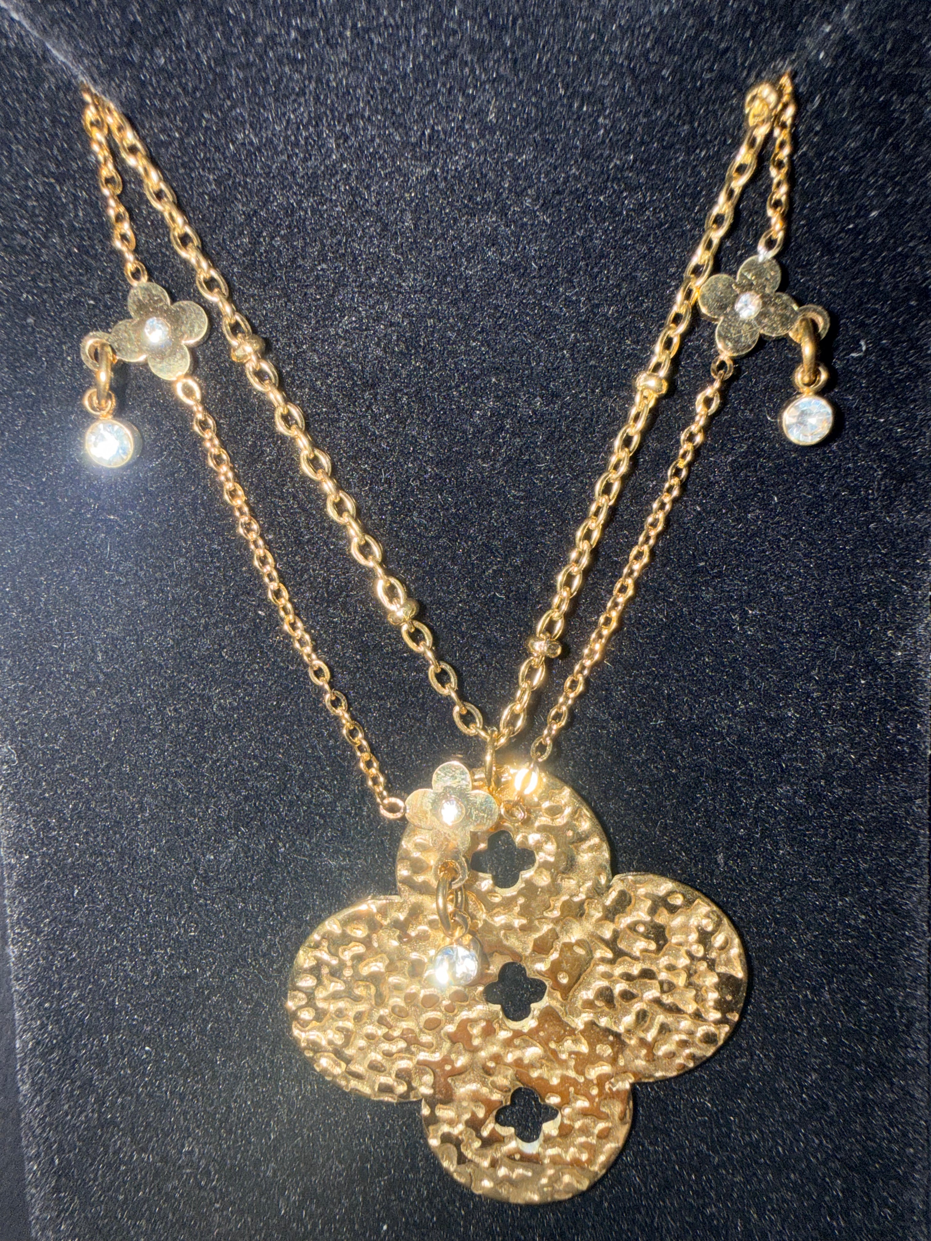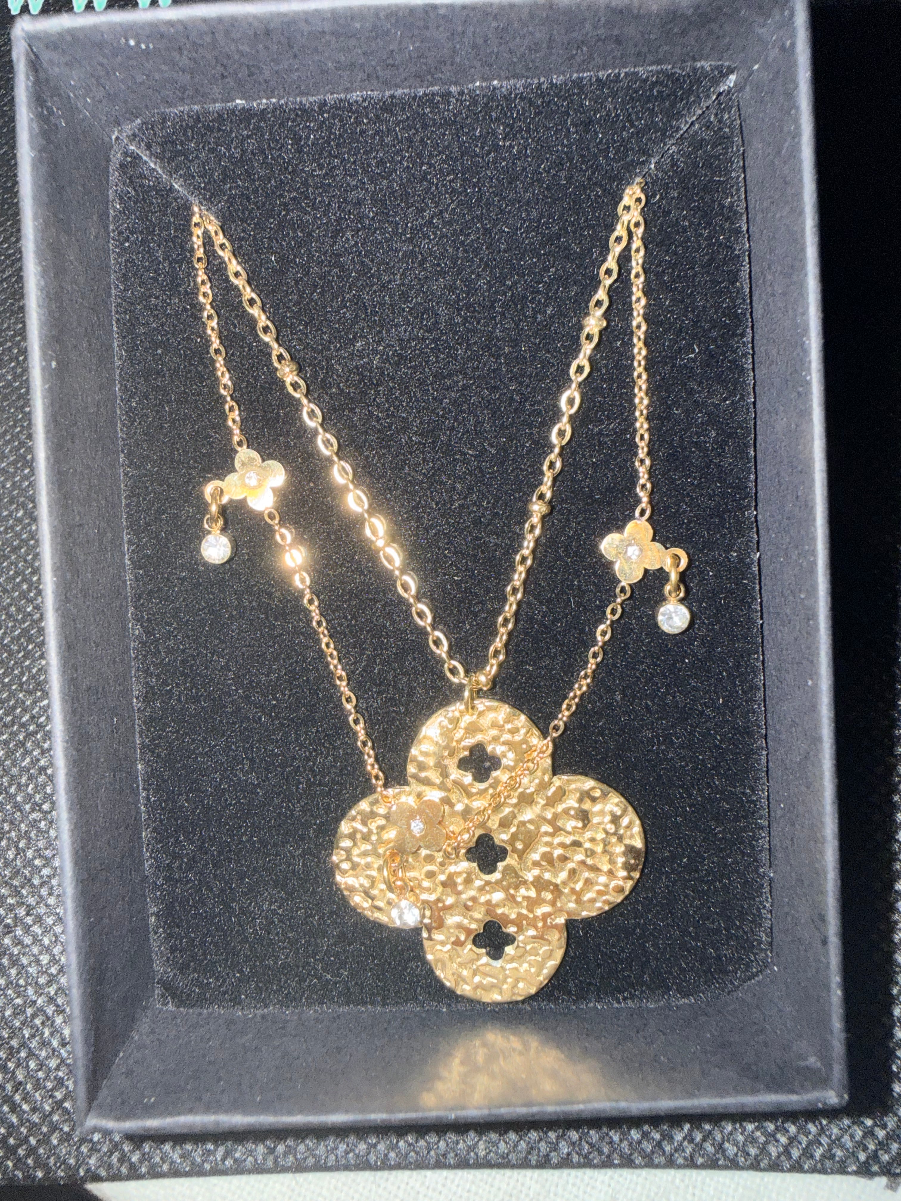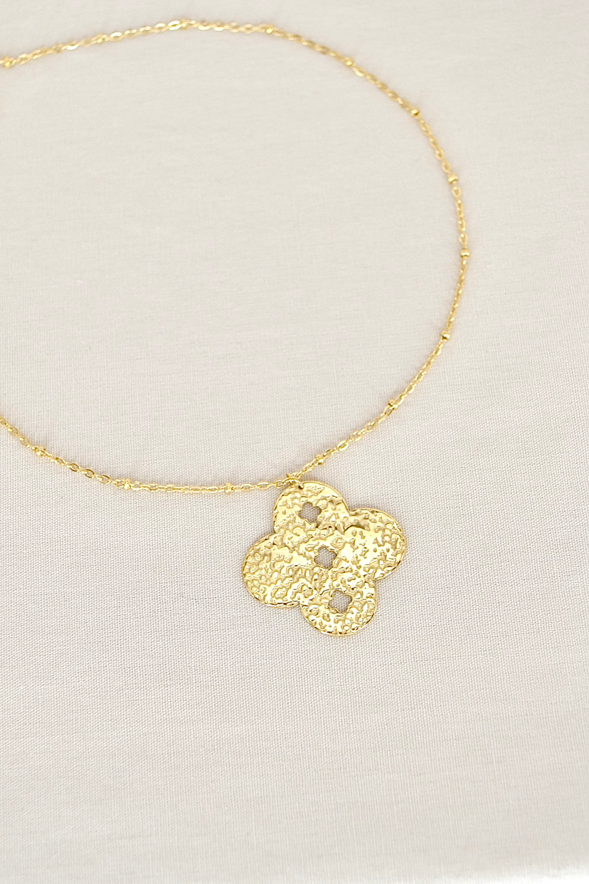 Son pendentif doré, délicatement martelé et inspiré de la fleur orientale porte-bonheur, capte la lumière à chaque mouvement pour offrir un éclat subtil et féminin.